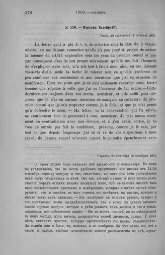 Морков Талейрану. Париж, 20 сентября (2 октября) 1803 // Paris. 143, 6. Подлинник. — Pétersbourg. Paris, 1803, 222. Список.