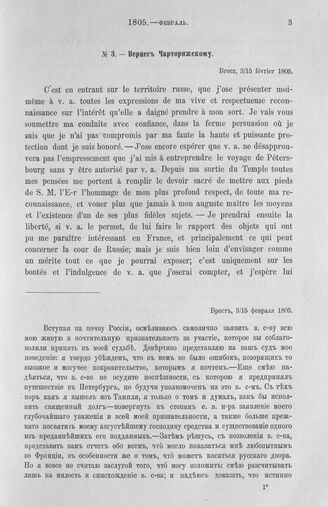 Вернег Чарторижскому. Заявление преданности. Брест, 3/15 февраля 1805 г. // Pétersbourg. Ministère, 1805, 136. Подлинник.