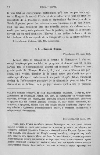 Записка Вернега. Виды Бонапарта на Италию. Петербург, 9/21 марта 1805 г.