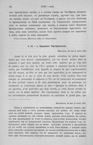 А. Воронцов Чарторижскому. Объяснение посылаемой политической записки. Матренино, 24 мая (5 июня) 1805 г. // Pétersbourg. Ministère, 1805, 17. Подлинник.