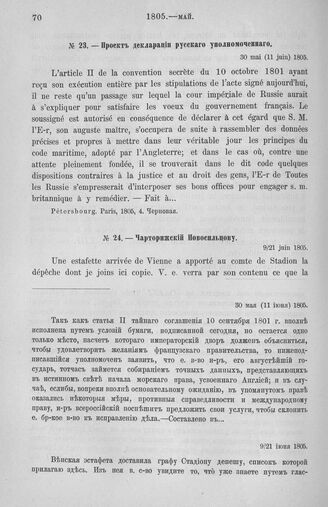 Чарторижский Новосильцову. Присоединение Лигурийской республики к Франции. Возвращение в Петербург из Берлина. 30 мая (11 июня) 1805 г. // Pétersbourg. Paris, 1805, 5. Черновая.
