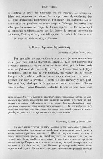 А. Воронцов Чарторижскому. Намерения Австрии и Англии. Значение коалиции. Матренино, 24 июля (5 августа) 1805 г. // Pétersbourg. Ministère, 1805, 47. Подлинник.