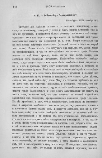 Вейдемейр Чарторижскому. Послы. Петербург, 12/24 сентября 1805 г. // Pétersbourg. Ministère, 1805, 57. Подлинник.