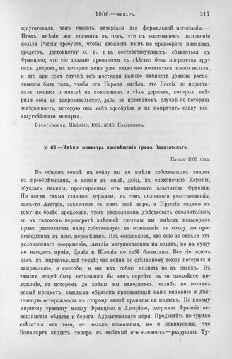 Начало года. Мнение министра просвещения гр. Завидовского. Соединение с Англией и Турцией. Переговоры с Бонапартом. Начало 1806 года // Pétersbourg. Ministère, 1806, 63/20. Подлинник.