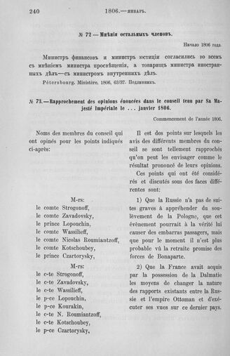 Начало года. Мнения остальных членов. Министра финансов и юстиции и товарища министра иностранных дел. Начало 1806 года // Pétersbourg. Ministère, 1806, 63/37. Подлинник.