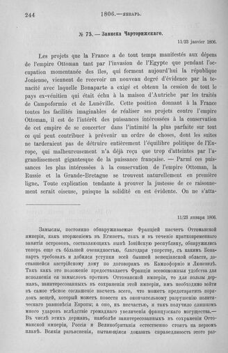 Записка Чарторижского. Замыслы Бонапарта насчет Порты. Меры против них. 11/23 января 1806 г. // Pétersbourg. Ministère, 1806, 63/6. Подлинник.