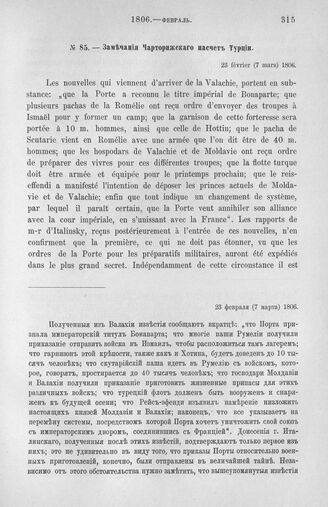 Замечания Чарторижского насчет Турции. Опасения со стороны Молдавии и Валахии. Их отношения к Бонапарту. Австрия и Пруссия. 23 февраля (7 марта) 1806 г. // Pétersbourg. Ministère, 1806, 7. Подлинник.