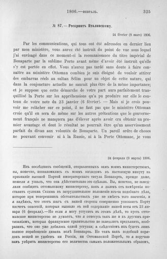 Рескрипт Италинскому. Императорский титул Бонапарта. Успокоение Порты и угрозы ей. Охранение Молдавии и Валахии. 24 февраля (8 марта) 1806 г. // Pétersbourg. Ministère, 1806, ad 7. Подлинник.