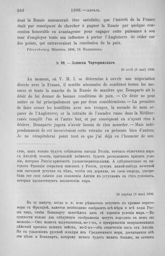 Записка Чарторижского. Необходимость усилить Корфу и удержать Каттаро. Сицилия и Англия. Порта. Усиление корпуса Сенявина. 26 апреля (8 мая) 1806
