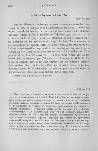 Чарторижский г-ну Убри. Англия. Пруссия и Швеция. Разумовский. 15/27 мая 1806 г.