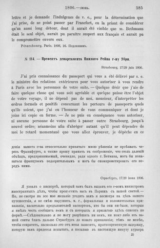 Префект департамента Нижнего Рейна г-ну Убри. Запрещение ехать дальше Страсбурга. Страсбург, 17/29 июня 1806 г. // Pétersbourg. Paris, 1806, ad 17. Список.