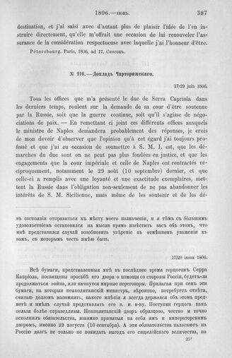 Доклад Чарторижского. Просьба неаполитанского короля. Необходимость поддержать его. Страсбург, 17/29 июня 1806 г. // Pétersbourg. Ministère, 1806, 30. Подлинник.