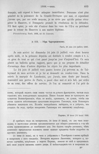 Убри Чарторижскому. Люкезини и Ярмут. Сицилия. Ганновер. Первое свидание с Талейраном. Русские пленные. Адриатика. Пруссия. Австрия. Второе свидание. Порта. Третья конференция. Париж, 28 июня (10 июля) 1806 г. // Pétersbourg. Paris, 1806, 19. Подлинник.