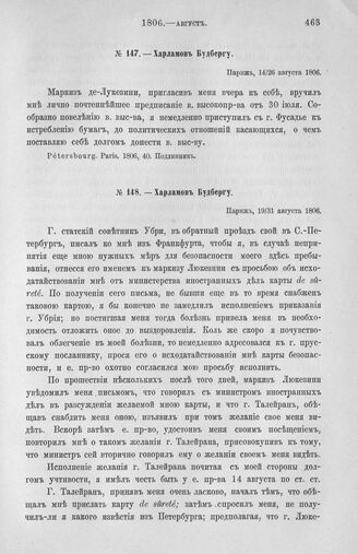 Харламов Будбергу. Вид на жительство в Париже. Талейран об утверждении договора и о возвращении Убри. Париж, 19/31 августа 1806 г.