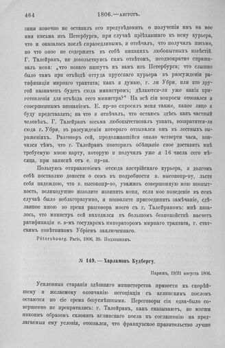 Харламов Будбергу. Неудача переговоров Франции с Англией. Присоединение Португалии к Испании. Слух о неутверждении договора и о морской победе англичан. Париж, 19/31 августа 1806 г. // Pétersbourg. Paris, 1806, 41. Подлинник.