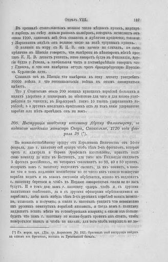 Инструкция шведскому капитану Абраму Фалькенгрену, за подписью шведского министра Спара, Стокгольм, 1720 года февраля 28 // Гл. морск. арх. (Дел. гр. Апраксина № 192).