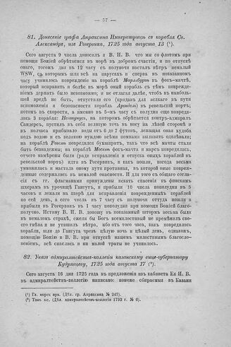Донесение графа Апраксина Императрице с корабля Св. Александр, из Рогервика, 1725 года августа 13 // Гл. морск арх. (Дел. гр. Апраксина № 247).