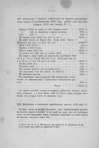 Ведомость о деньгах, потребных на строение кронштадтского канала к предбудущему 1726 году; подана от виц.-адм. Сиверса, 1725 года декабря 22 // Моск. арх. М. И. Д. (Письма виц.-адм. Сиверса к кн. Меншикову № 22).