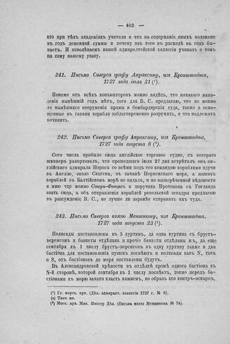 Письмо Сиверса князю Меншикову, из Кронштадта, 1727 года августа 23 // Моск. арх. Мин. Иностр. Дел. (Письма князя Меншикова № 74).