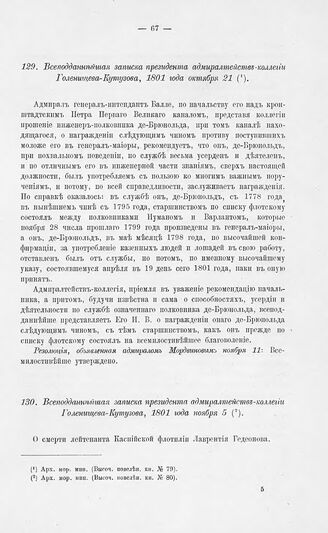 Всеподданнейшая записка президента адмиралтейств-коллегии Голенищева-Кутузова, 1801 года ноября 5 // Арх. мор. мин. (Высоч. повелен. кн. № 80).