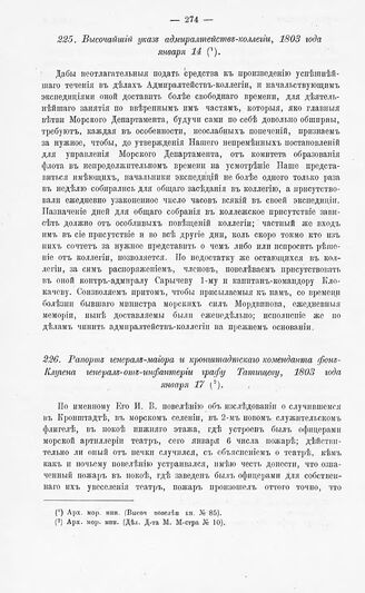 Рапорт генерал-майора и кронштадтского коменданта фон-Клугена генерал-от-инфантерии графу Татищеву, 1803 года января 17 // Арх. мор. мин. (Дел. Д-та М. М-стра № 10).