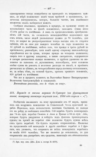 Перевод с письма маркиза де-Траверсе (на французском языке) товарищу министра морских сил, 1804 года апреля // Арх. мор. мин. (Дел. Д-та м. м-стра № 4079).