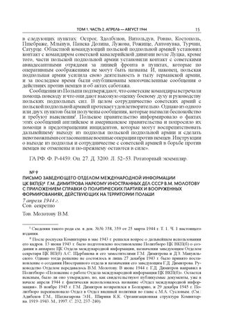 Письмо заведующего Отделом международной информации ЦК ВКП(б) Г.М. Димитрова наркому иностранных дел СССР В.М. Молотову с приложением справки о политических партиях и вооруженных формированиях, действующих на территории Польши. 7 апреля 1944 г. // РГАСПИ. Ф. 82. Оп. 2. Д. 1288. Л. 8–13. Подлинник. Копия. Машинопись. Опубликовано: Советско-польские отношения 1918–1945 гг.: Сб. документов: В 4 т. Т. 4: 1939–1945. М., 2017. С. 485–488.