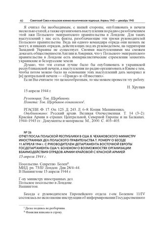 Отчет посла Польской Республики в США Я. Чехановского министру иностранных дел Польского правительства Т. Ромеру о беседе 11 апреля 1944 г. с руководителем департамента Восточной Европы Госдепартамента США Ч. Боленом о возможностях организации взаимодействия отрядов Армии Крайовой с Красной армией. 15 апреля 1944 г. // IPMS. PRM. А. 11. 73/6. К. 165–173. Подлинник. Машинопись. Польский язык.