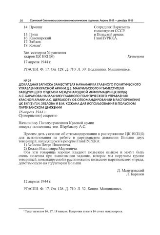 Докладная записка заместителя начальника Главного Политического управления Красной армии Д.З. Мануильского и заместителя заведующего Отделом международной информации ЦК ВКП(б) Л.С. Баранова начальнику Главного Политического управления Красной армии А.С. Щербакову об откомандировании в распоряжение ЦК ВКП(б) П.И. Зяблова и В.М. Кожана для использования в польском партизанском движении. 18 апреля 1944 г.