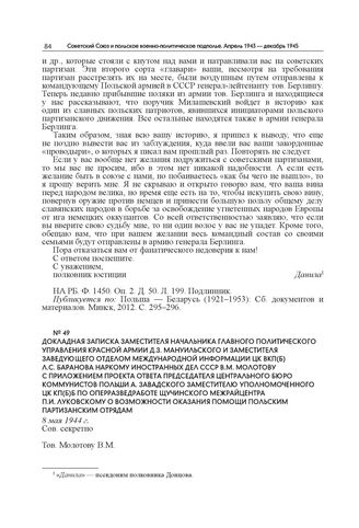 Докладная записка заместителя начальника Главного политического Управления Красной армии Д.З. Мануильского и заместителя заведующего Отделом международной информации ЦК ВКП(б) Л.С. Баранова наркому иностранных дел СССР В.М. Молотову с приложением проекта ответа председателя Центрального бюро коммунистов Польши А. Завадского заместителю уполномоченного ЦК КП(б)Б по оперразведработе Щучинского межрайцентра П.И. Луковскому о возможности оказания помощи польским партизанским отрядам. 8 мая 1944 г. // РГАСПИ. Ф. 82. Оп. 2. Д. 1288. Л. 49–50. Подлинник. Копия. Машинопись.