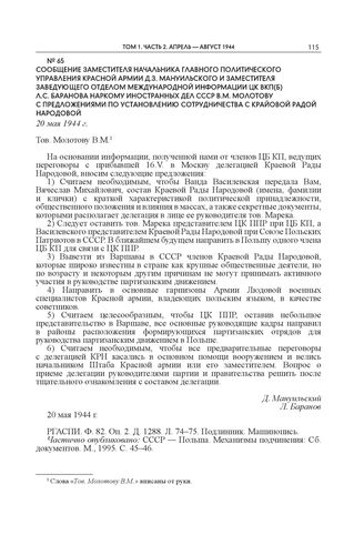 Сообщение заместителя начальника Главного политического управления Красной армии Д.З. Мануильского и заместителя заведующего Отделом международной информации ЦК ВКП(б) Л.С. Баранова наркому иностранных дел СССР В.М. Молотову с предложениями по установлению сотрудничества с Крайовой Радой Народовой. 20 мая 1944 г. // РГАСПИ. Ф. 82. Оп. 2. Д. 1288. Л. 74–75. Подлинник. Машинопись. Частично опубликовано: СССР — Польша. Механизмы подчинения: Сб. документов. М., 1995. С. 45–46.