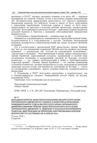 Докладная записка заместителя начальника Белорусского штаба партизанского движения И.П. Ганенко и заместителя начальника Разведывательного отдела Белорусского штаба партизанского движения Ливанова первому заместителю Белорусского штаба партизанского движения Г.Б. Эйдинову о польском вооруженном подполье, действующем на территории оккупированных районов Белоруссии по состоянию на 25 апреля 1944 г. 24 мая 1944 г. // НА РБ. Ф. 1450. Оп. 2. Д. 49. Л. 146–165. Заверенная копия. Машинопись