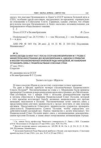 Запись беседы 26 мая 1944 г. посла СССР в Великобритании Ф.Т. Гусева с министром иностранных дел Великобритании А. Иденом о прибытии в Москву уполномоченных Крайовой Рады Народовой, их намерении установить связь с правительствами союзных стран. 27 мая 1944 г. // АВП РФ. Ф. 06. Оп. 6. Д. 236. П. 23. Л. 211–212. Подлинник. Машинопись.