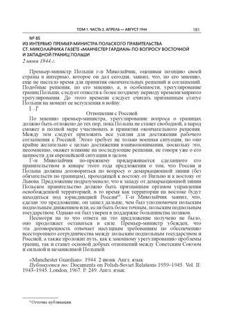 Из интервью премьер-министра Польского правительства Ст. Миколайчика газете «Манчестер Гардиан» по вопросу восточной и западной границ Польши. 2 июня 1944 г. // «Manchester Guardian». 1944. 2 июня. Англ. язык. Публикуется по: Documents on Polish-Soviet Relations 1939–1945. Vol. II: 1943–1945. London, 1967. P. 249. Англ. язык