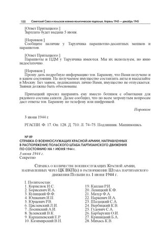 Справка о военнослужащих Красной армии, направленных в распоряжение Польского штаба партизанского движения по состоянию на 1 июня 1944 г. 3 июня 1944 г.
