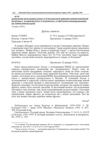 Донесение начальника штаба 27-й Волынской дивизии Армии Крайовой капитана Т. Климковского о контактах с советским командованием на территории Волыни. 4 июня 1944 г. // Публикуется по: Armia Krajowa w dokumentach. 1939–1945. T. III: Kwiecień 1943 — lipiec 1944. Wrocław—Warszawa—Kraków, 1991. S. 467–468. Польский язык. Опубликовано: Русский архив. Великая Отечественная. Т. 14 (3–1): СССР и Польша. 1941–1945. К истории военного союза: Документы и материалы. М., 1994. С. 459.