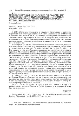 Телеграмма посла США в СССР У.А. Гарримана государственному секретарю США К. Хэллу о содержании беседы с В.М. Молотовым накануне визита премьер-министра Польского правительства Ст. Миколайчика в Вашингтон. 7 июня 1944 г. // Публикуется по: FRUS. 1944. Vol. III: The British Commonwealth and Europe. Washington, 1965. P. 1276–1277. Англ. язык.