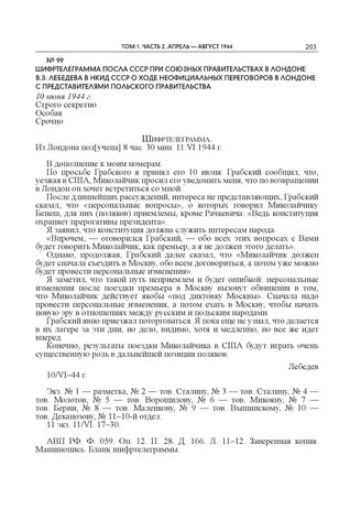 Шифртелеграмма посла СССР при Союзных правительствах в Лондоне В.З. Лебедева в НКИД СССР о ходе неофициальных переговоров в Лондоне с представителями Польского правительства. 10 июня 1944 г.