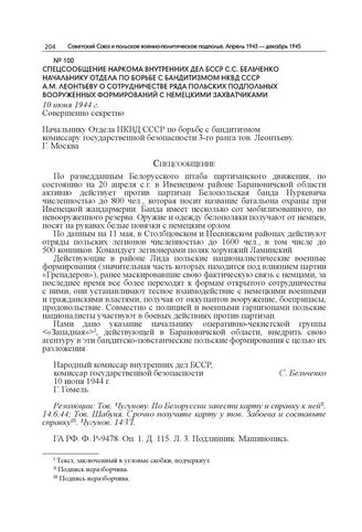 Спецсообщение наркома внутренних дел БССР С.С. Бельченко начальнику Отдела по борьбе с бандитизмом НКВД СССР А.М. Леонтьеву о сотрудничестве ряда польских подпольных вооруженных формирований с немецкими захватчиками. 10 июня 1944 г.