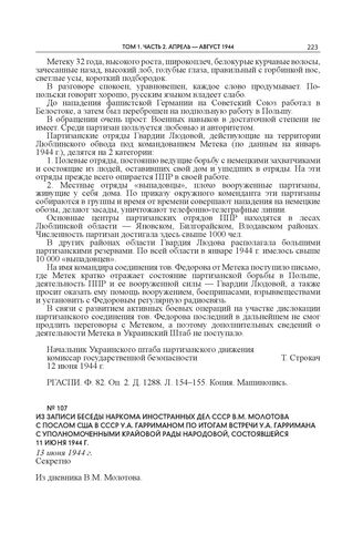 Из записи беседы наркома иностранных дел СССР В.М. Молотова с послом США в СССР У.А. Гарриманом по итогам встречи У.А. Гарримана с уполномоченными Крайовой Рады Народовой, состоявшейся 11 июня 1944 г. 13 июня 1944 г. // АВП РФ. Ф. 06. Оп. 6. Д. 17. П. 1. Л. 29–31, 33. Подлинник. Машинопись. Опубликовано: Советско-польские отношения 1918–1945 гг.: Сб. документов: В 4 т. Т. 4: 1939–1945. М., 2017. С. 522–524.