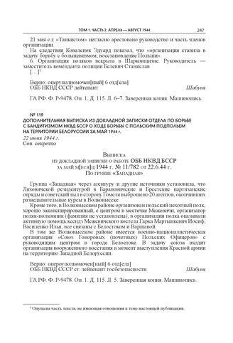 Дополнительная выписка из докладной записки Отдела по борьбе с бандитизмом НКВД БССР о ходе борьбы с польским подпольем на территории Белоруссии за май 1944 г. 22 июня 1944 г. // ГА РФ. Ф. Р-9478. Оп. 1. Д. 115. Л. 5. Заверенная копия. Машинопись.