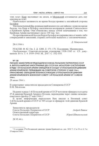 Письмо заместителя председателя Союза Польских Патриотов в СССР А. Витоса наркому иностранных дел СССР В.М. Молотову о вступлении в ряды 1-й Польской армии офицеров и солдат 27-й Волынской дивизии Армии Крайовой, перешедших на советскую сторону 27 мая 1944 г. Приложение: Обращение военнослужащих 27-й Волынской дивизии Армии Крайовой к Военному совету 1-й Польской армии от 15 июня 1944 г. 28 июня 1944 г. // РГАСПИ. Ф. 82. Оп. 2. Д. 1286. Л. 144–146. Подлинник. Копия. Машинопись.