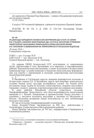Из доклада народного комиссара внутренних дел СССР Л.П. Берии И.В. Сталину, наркому иностранных дел СССР В.М. Молотову и первому заместителю начальника Генерального штаба Красной армии А.И. Антонову о выявленном на территории БССР польском подполье. 29 июня 1944 г. // ГА РФ. Ф. Р-9401. Оп. 2. Д. 65. Л. 271–274. Заверенная копия. Машинопись. Опубликовано: НКВД — МВД СССР в борьбе с бандитизмом и вооруженным националистическим подпольем на Западной Украине, в Западной Белоруссии и Прибалтике (1939–1956). М., 2008. С. 162–164.