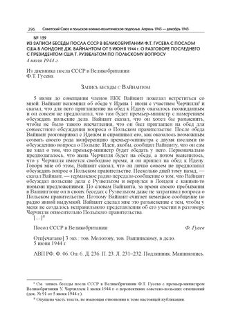 Из записи беседы посла СССР в Великобритании Ф.Т. Гусева с послом США в Лондоне Дж. Вайнантом от 5 июня 1944 г. о разговоре последнего с президентом США Т. Рузвельтом по польскому вопросу. 4 июля 1944 г.