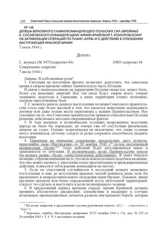 Депеша Верховного главнокомандующего Польских Сил Збройных К. Соснковского командующему Армии Крайовой Т. Коморовскому об активизации операций по плану «Буря» и о действиях в отношении наступающей Красной армии. 7 июля 1944 г.