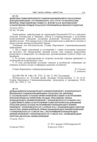 Депеша шифром командующего Армией Крайовой Т. Коморовского Верховному главнокомандующему Польских Сил Збройных К. Соснковскому о планах Армии Крайовой в связи со вступлением Красной армии на территорию Польши. Приложение: приказ командующего Армией Крайовой Т. Коморовского от 23 марта 1944 г. о действиях в связи со вступлением советских войск на довоенные польские земли; особое распоряжение командующего Армией Крайовой Т. Коморовского от 14 апреля 1944 г. командующему округом «Белосток» Армии Крайовой; приказ командующего Армией Крайовой Т. Коморовского от 12 июля 1944 г.; распоряжение командующего Армией Крайовой Т. Коморовского от 11 июля 1944 г. командующему округом «Белосток» Армии Крайовой. 14 июля 1944 г. // Публикуется по: Armia Krajowa w dokumentach. 1939–1945. T. III: Kwiecień 1943 — lipiec 1944. Wrocław—Warszawa—Kraków, 1991. S. 546–559. Польский язык. Частично опубликовано: Русский архив. Великая Отечественная. Т. 14 (3–1): СССР и Польша. 1941–1945 гг. К истории военного союза: Документы и материалы. М., 1994. С. 455–456, 457–458, 460–461, 461–463.