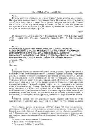 Из записи беседы премьер-министра Польского правительства Ст. Миколайчика с премьер-министром Великобритании У. Черчиллем и министром иностранных дел А. Иденом о возможности британского вмешательства в связи с угрозой разоружения советским командованием отрядов Армии Крайовой в районе г. Вильно. 18 июля 1944 г. // Публикуется по: Documents on Polish-Soviet Relations 1939–1945. Vol. II: 1943–1945. London, 1967. P. 290–291. Англ. язык.