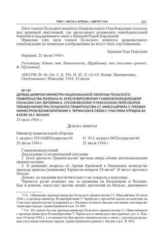 Депеша шифром министра национальной обороны Польского правительства генерала М. Кукеля Верховному главнокомандующему Польских Сил Збройных К. Соснковскому о результатах переговоров премьер-министра Польского правительства Ст. Миколайчика с премьер-министром Великобритании У. Черчиллем в связи с участием отрядов АК в боях за г. Вильно. 21 июля 1944 г. // Публикуется по: Armia Krajowa w dokumentach. 1939–1945. T. III: Kwiecień 1943 — lipiec 1944. Wrocław—Warszawa—Kraków, 1991. S. 570–571. Польский язык.