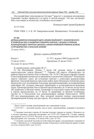 Депеша шифром командующего Армии Крайовой Т. Коморовского в Правительство о развитии событий в районе г. Вильно и приказе командующего округом «Вильно» Армии Крайовой прервать всякое сотрудничество с Красной армией. 21 июля 1944 г. // IPMS. PRM. L. 6. K. 80. Заверенная копия. Машинопись. Польский язык. Опубликовано: Armia Krajowa w dokumentach. 1939–1945. T. III: Kwiecień 1943 — lipiec 1944. Wrocław—Warszawa—Kraków, 1991. S. 564–565. Польский язык; Русский архив. Великая Отечественная. Т. 14 (3–1): СССР и Польша. 1941–1945. К истории военного союза: Документы и материалы. М., 1994. С. 465–466.