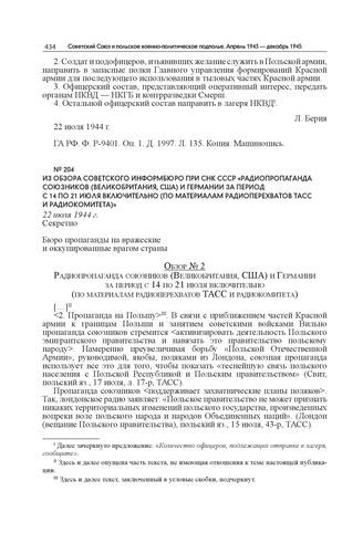 Из обзора Советского информбюро при СНК СССР «Радиопропаганда союзников (Великобритания, США) и Германии за период с 14 по 21 июля включительно (по материалам радиоперехватов ТАСС и радиокомитета)». 22 июля 1944 г. // ГА РФ. Ф. Р-8581. Оп. 2. Д. 107. Л. 18–34. Подлинник. Машинопись.